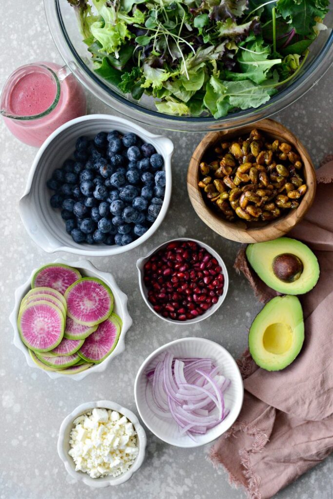 Step 1: Preparation Rinse and dry the spring mix thoroughly so it stays crisp. Wash the blueberries and set them aside. Shell the pistachios if needed and measure all ingredients so everything is ready before assembling the salad.